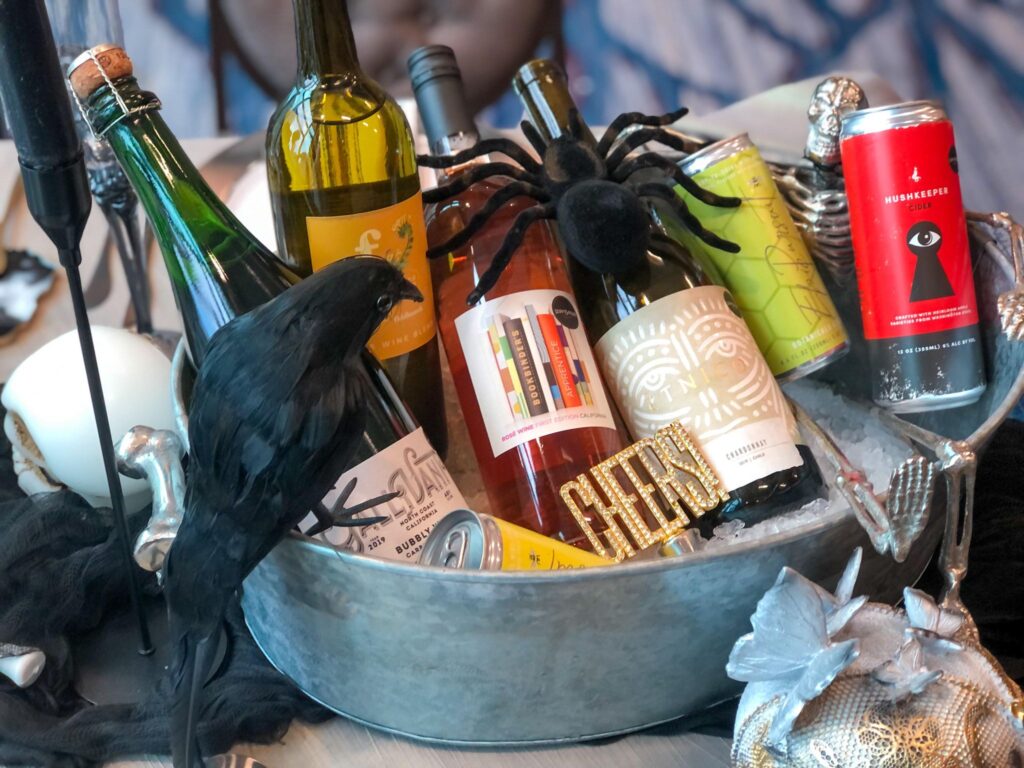 elcome all your ghouls and goblins this Halloween to a spooky yet chic themed tablescape. We partnered with friend of the company and in life Savannah from Savvy & Clean Wines on this festive and fun tablescape. We brought the rentals and she brought the booze and some of her beautiful resin pieces, i’d say thats a great partnership in any definition of the meaning. Using majority in-house rentals and beverages we used color ways that incorporated mixed metals of silver and gold to bring depth and chicness to the halloween spirit. Featuring our Selenite votives, Black tube vase, and Gold trio candle holder I used a olive taffeta tablecloth…