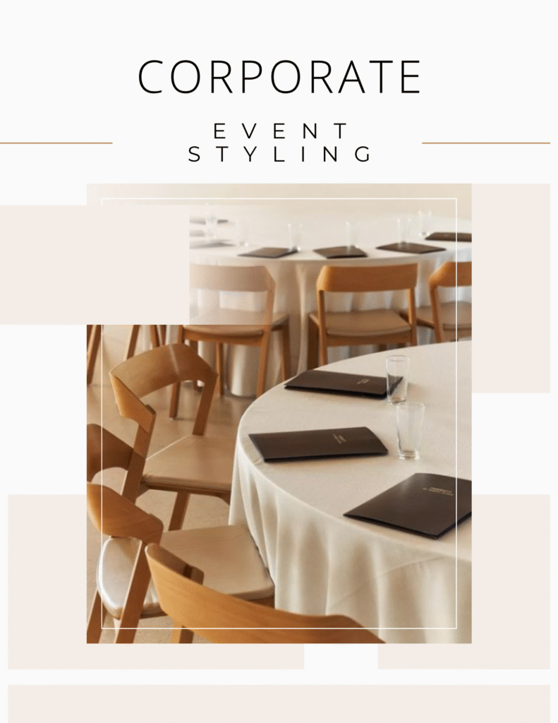 - A comprehensive styling brief highlighting mood, colour palette, installation concepts, invitations, signage, tableware, florals, photo backdrops and props.